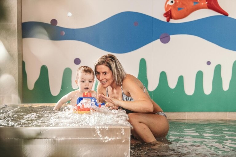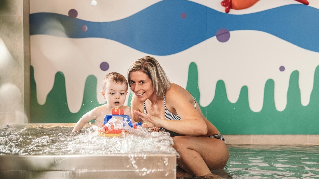 Im Hallenbad-Bereich wartet purer Wasserspaß auf die Kleinsten: Zusammen mit Maskottchen Almi entdecken Babys das bunte Planschbecken und den blubbernden Baby-Whirlpool. Ob auf der Babyrutsche sausen oder die Riesen-Schildkröte erkunden – lustige Spielsachen sorgen für strahlende Augen. Zum Ausruhen und Träumen laden die gemütlichen Kuschelnester ein. Ein perfekter Ort für erste Badeabenteuer!