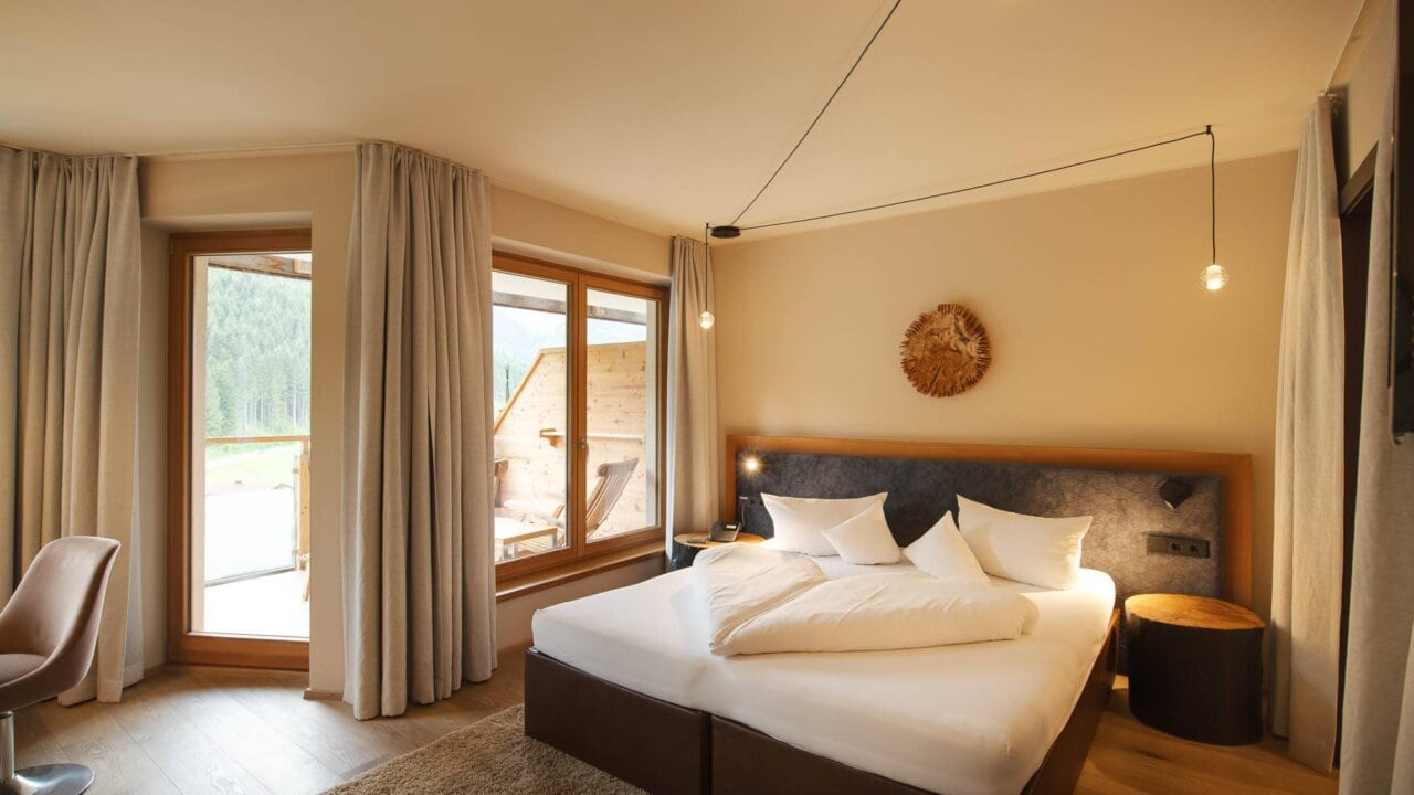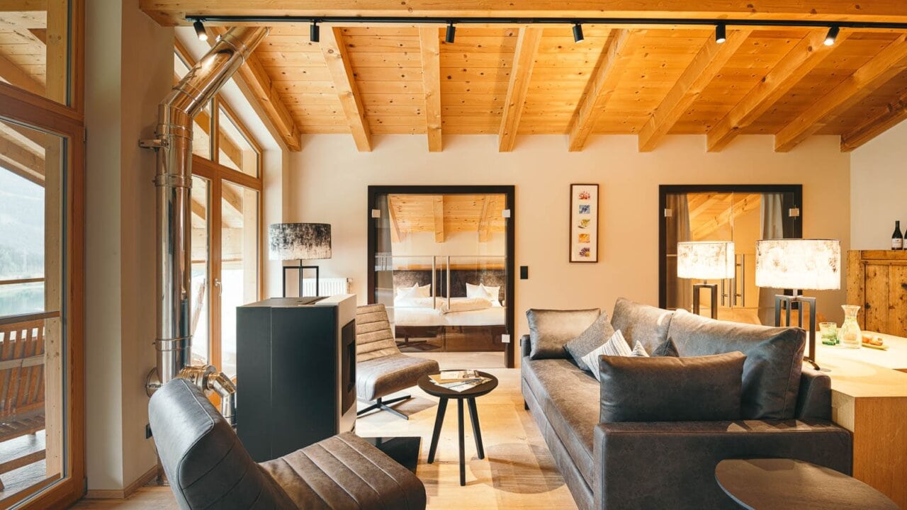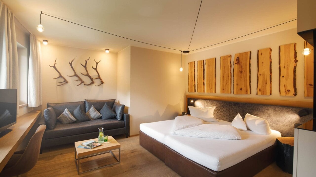 Suite mit Vorraum und Platz für Ihre Garderobe, mit getrenntem Kinderzimmer (mit Stockbett – Maße: 80 x 180 cm), einem abgetrennten stylischen Wohn- Schlafraum mit 2,00 m Betten, behaglichem elegantem Holz-Dielenboden, Kuschel-Couch, sowie Ausstieg zur großen, optisch abgetrennten Gemeinschaftsterrasse.