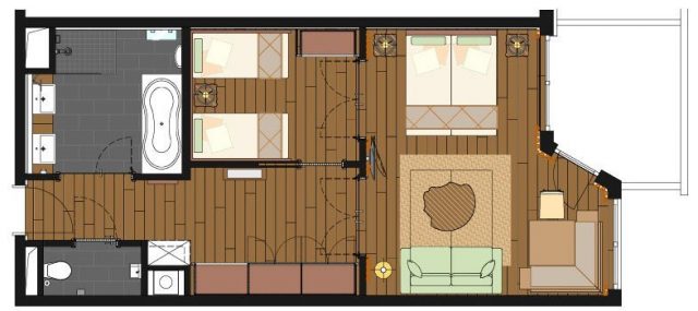 Vorraum mit viel Platz für Ihre Garderobe, getrenntem Kinderzimmer (1 Einzelbett und ein Stockbett – Maße: 80 x 190 cm, mit Schreibtisch und TV), einem abgetrennten stylischen Wohn-Schlafraum mit 2,10 m Betten, Vinothek, behaglichem elegantem Holz-Dielenboden, Erker und Kuschel-Couch.