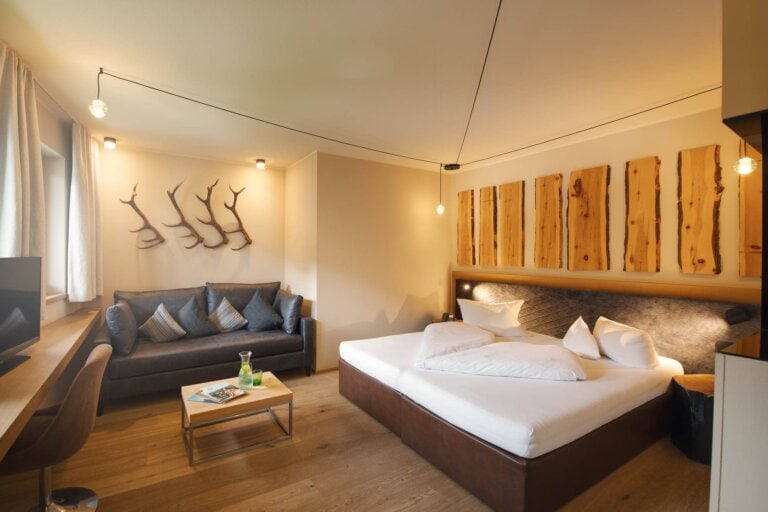 Die Wellness Suite verfügt über Balkon, Vorraum, getrenntes Kinderzimmer (1 Einzelbett und ein Stockbett – Maße: 80 x 180 cm, mit Schreibtisch und TV), stylischen Wohn- Schlafraum mit 2,10 m Betten und Kuschel-Couch, Vinothek und behaglichen eleganten Holz-Dielenboden.