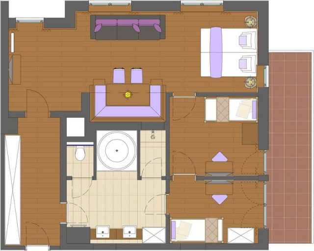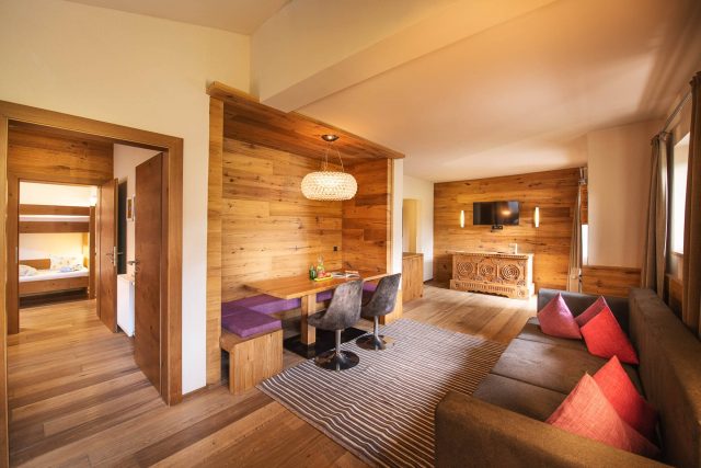 The “Jumbo Loft Suite” has a small roof terrace and a large balcony. The suite has an elegant wooden floor and is equipped with an anteroom, walk-in wardrobe, 2 separate children’s rooms with bunk beds, seating, large comfortable and stylish living and sleeping area with a cosy couch and large familiy table.