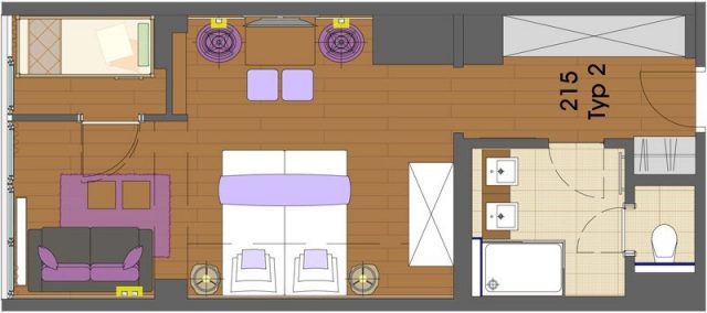 Junior Suite without balcony equipped with a small separate children’s room suitable for 2 children (with bunk beds – measurement 80 x 190 cm), anteroom, furniture made of light ash wood, stylish living and sleeping area with sitting area and cosy couch/daybed (for another child), elegant wooden floor.