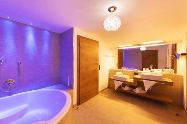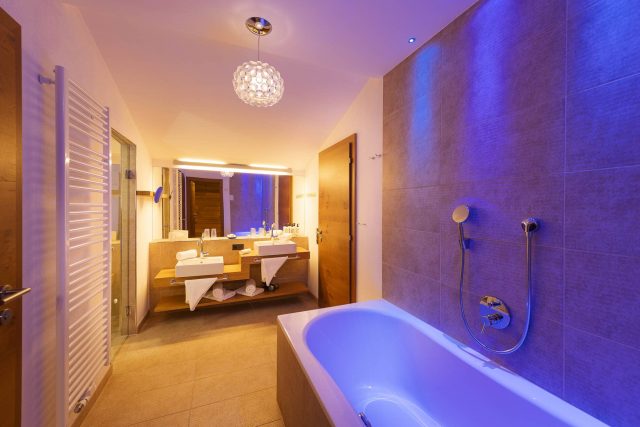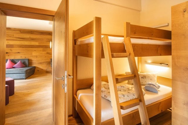 Spacious suite in modern alpine style with a very large balcony or loggia with a fantastic view. The suite has an elegant wooden floor and is equipped with an anteroom, walk-in wardrobe, 2 separate children’s rooms with bunk beds and flat TV. Comfortable, stylish living and sleeping area for the parents with a cosy couch and elegant lounge chairs.