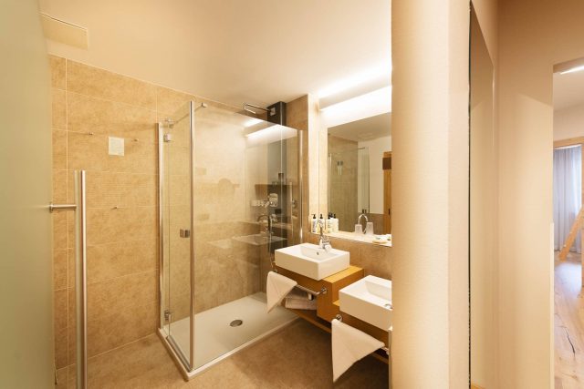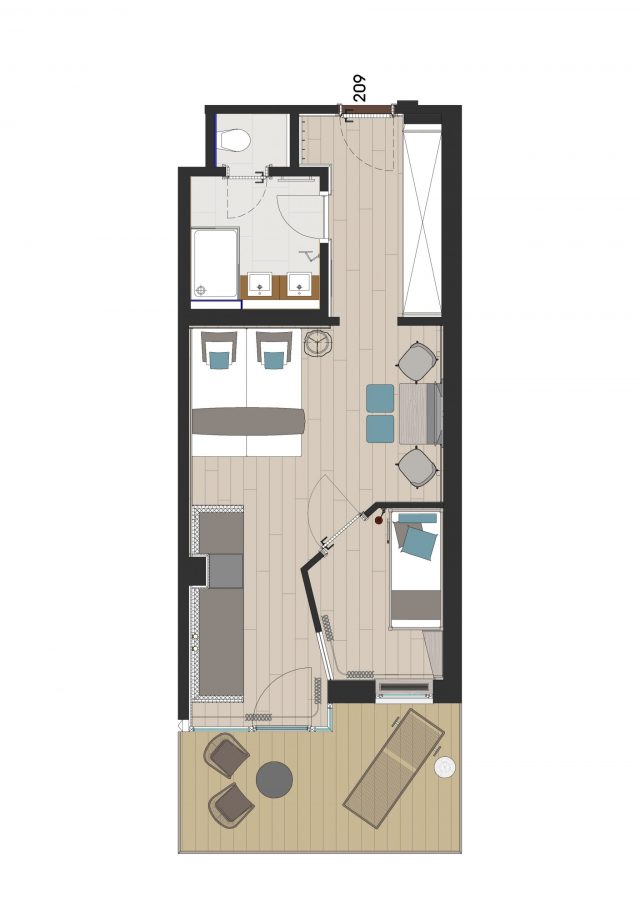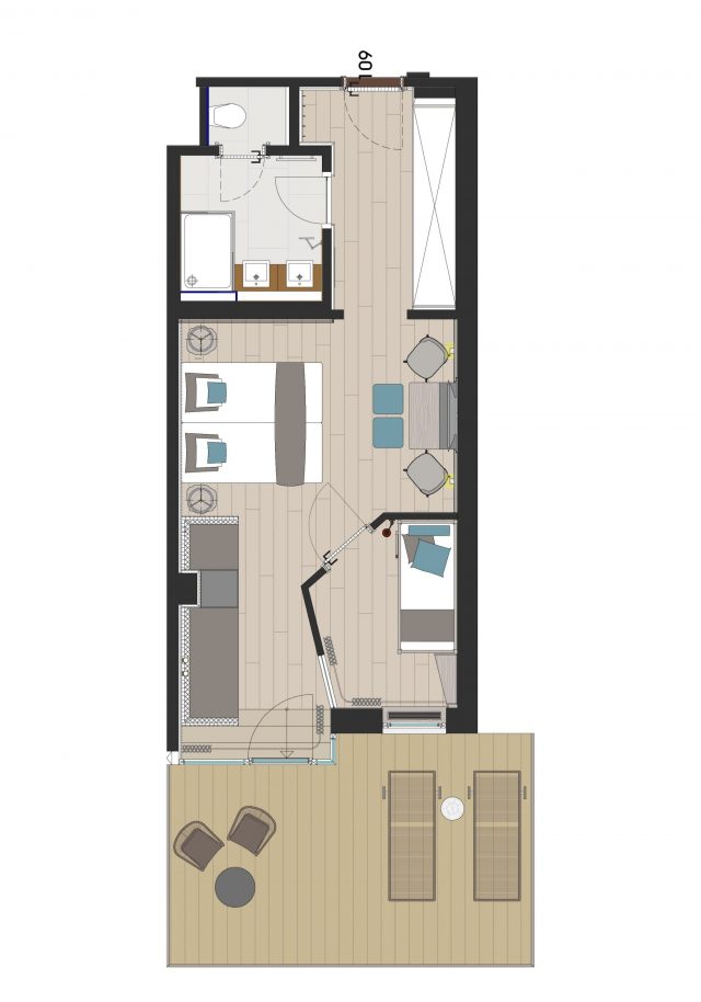 Suite with small separate children’s room (with bunk beds – measurements 80 x 190 cm), anteroom, furniture made of light ash wood, wooden floor, curtains in light colours, stylish living and sleeping area, cosy couch and large balcony.
